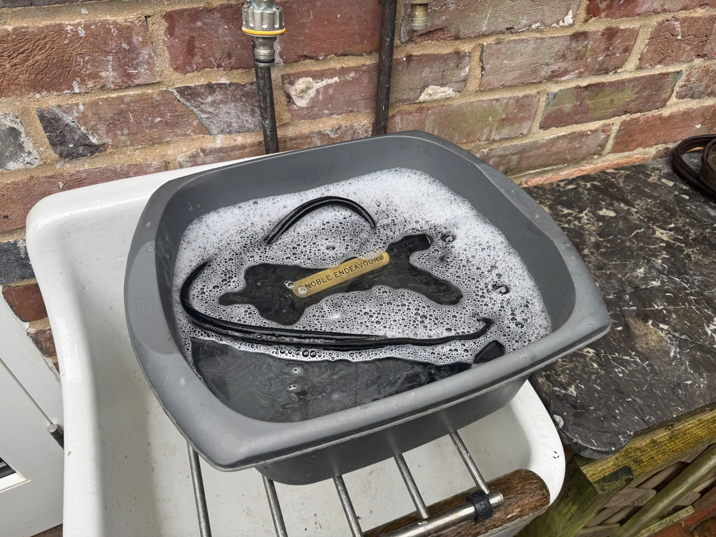 We gently dismantle the head collar into its component parts: leather straps, buckles, and brass fittings.